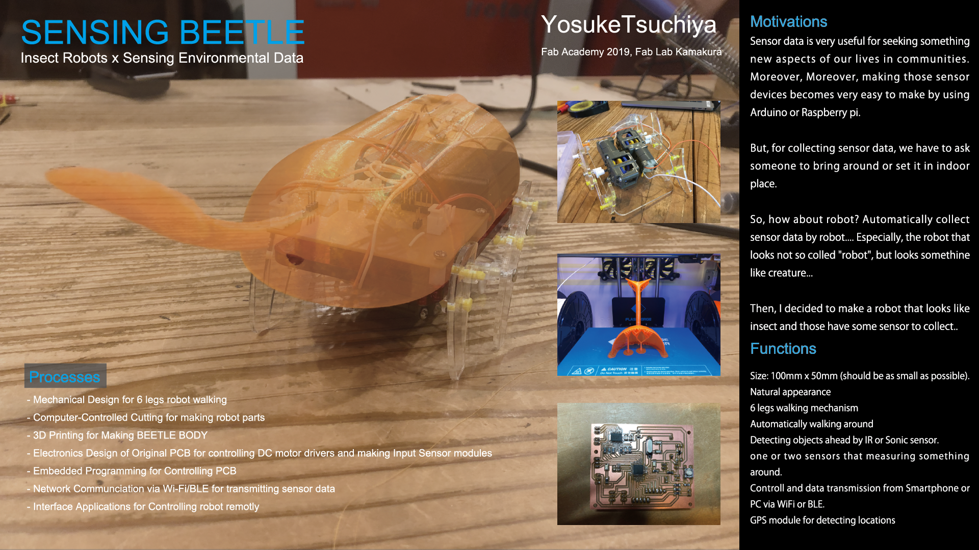 My final project is titled as “SENSING BEETLE”, that is a Insect Robot with adding some sensing function of Our live environmental conditions. When I decided to join Fab Academy, there are two things I want to make. One is a robot that is automatically moving around and looks something like a insects. Another is portable data logger that have multiple sensors measuring something unmeasured (means measuiring something new aspects of our daily lives, our environment or our society). The sketch shows combined idea of those I want to make. That is insect robot that collecting data in a viewpoint of insects.