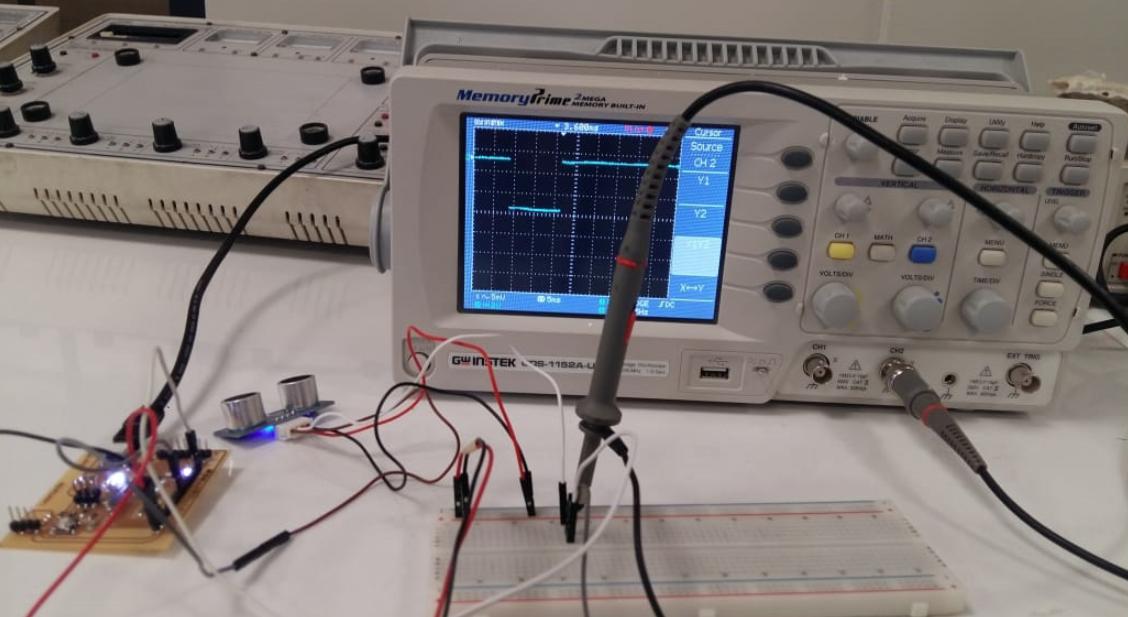 digital signal in Oscilloscope using arduino Leonardo. A sensor is connected with arduino and the pin of Echo is connected with Oscilloscope. Arduino Leonardo is programmed to detect obstacle