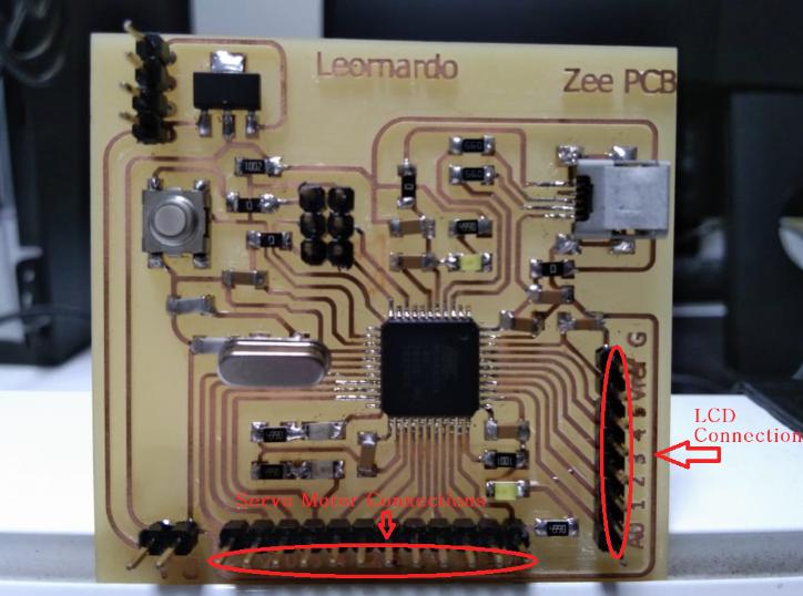 have four electronics parts which are used like Aduino Leonardo designed by azmat and me which we used for programming, six 360 degree continuous rotation servo motors used for discharging chambers, bluetooth module