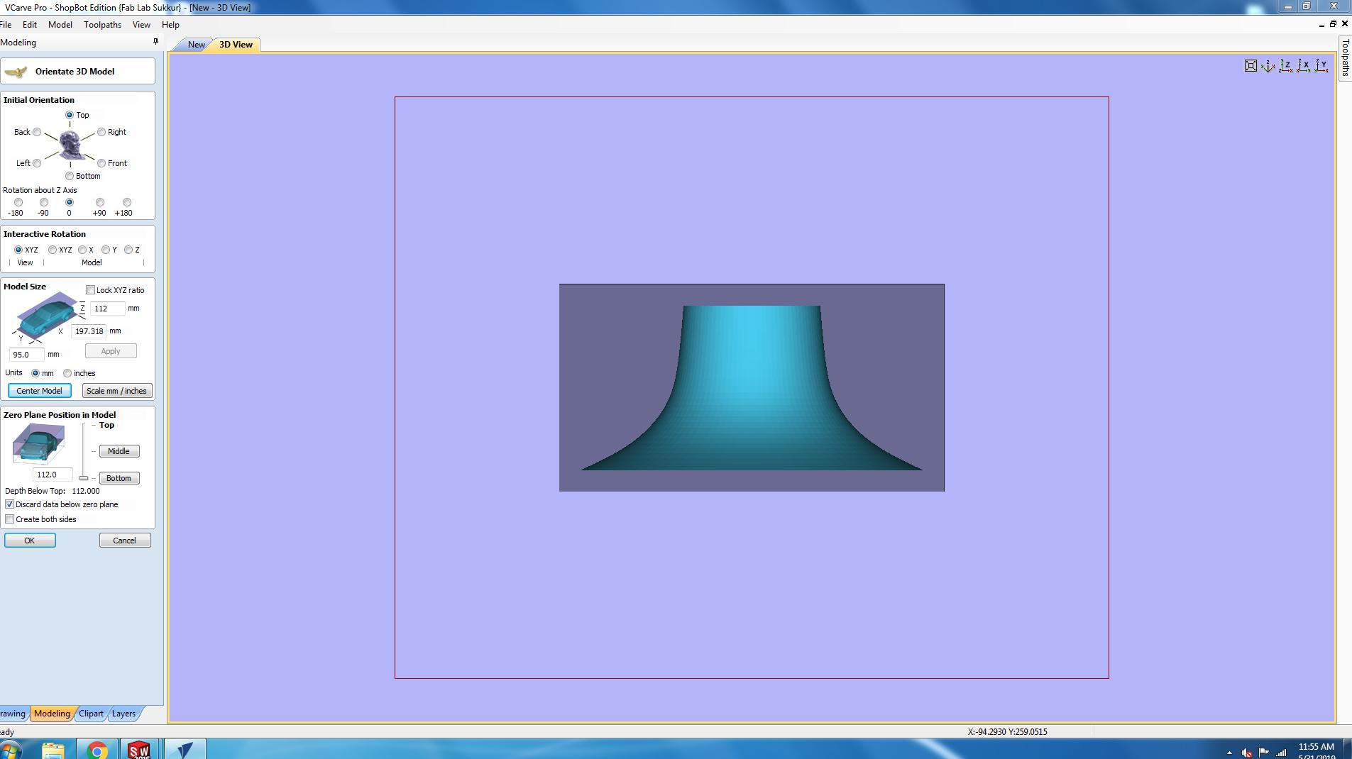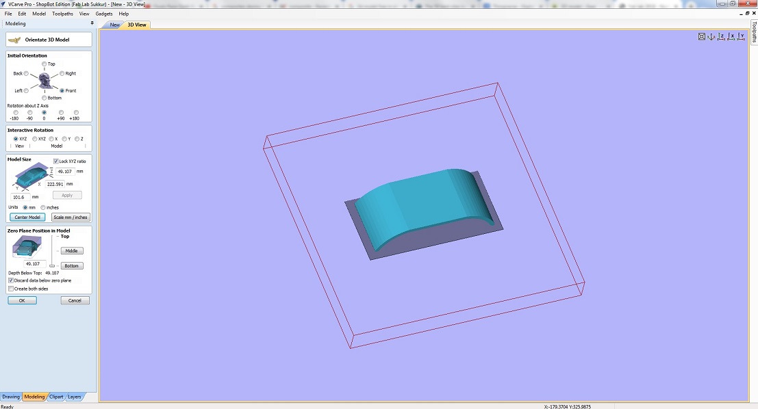 • When the .stl file is imported on Vcarve now set the initial orientation, interactive rotation model size and other things and press ok.