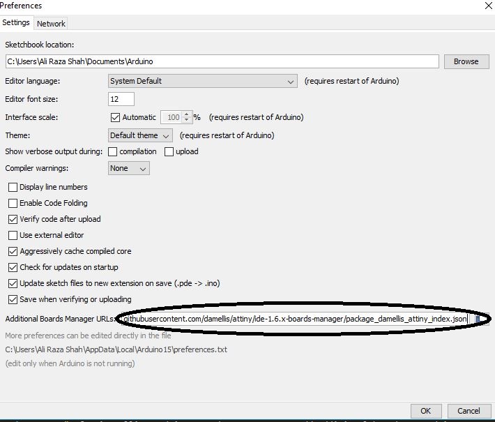 Afte installing Arduino IDE the next step to add additional boards to Arduino IDE. For that we need to Files than References and put this address (https://raw.githubusercontent.com/damellis/attiny/ide-1.6.x-boards-manager/package_damellis_attiny_index.json) to the Additional Board Managar. NOTE: you must have Arduino IDE 1.81 for this step.