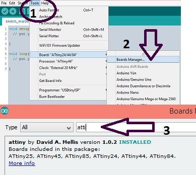 The next step is to add Attiny library. For that we need to go tools -> board -> board manager. Here we need to install the library shown in image given below.