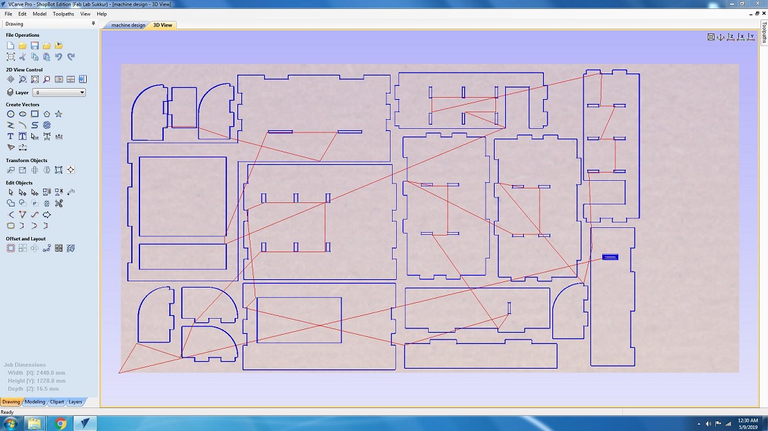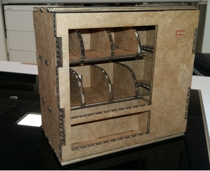 We tried to cut this in shopbot where we used laminated 16mm thick mdf sheet. After cnc milling we assembled this machine in a team and proceeded further. The cutting process and assembly of design is shown figure (a) and (d) respectively. Furthermore we laser cut the front panel which is also shown figure (b) and (c). It was nice experience to work togethor.