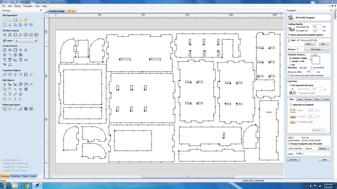This part was done by our group member Mr. Haider. In cnc milling we normally use vcarve software for generating toolpaths. Before generating any tool path he used dog bones in order to pressfit the design accurately and used tabs at various points just to hook up the parts in mdf card board. Since we are using the Liquid crystal display (LCD) so for that he used pocket toolpath and for cutting he used profile toolpath. The generated pocket tool paths, profile toolpaths and 3d view of toolpaths is shown below in figure(a), (b) and (c) respectively. Furthermore it can also be seen in figure (a) that there is joint between two parts i-e front panel which is minor mistake and was resolved after cnc milling.