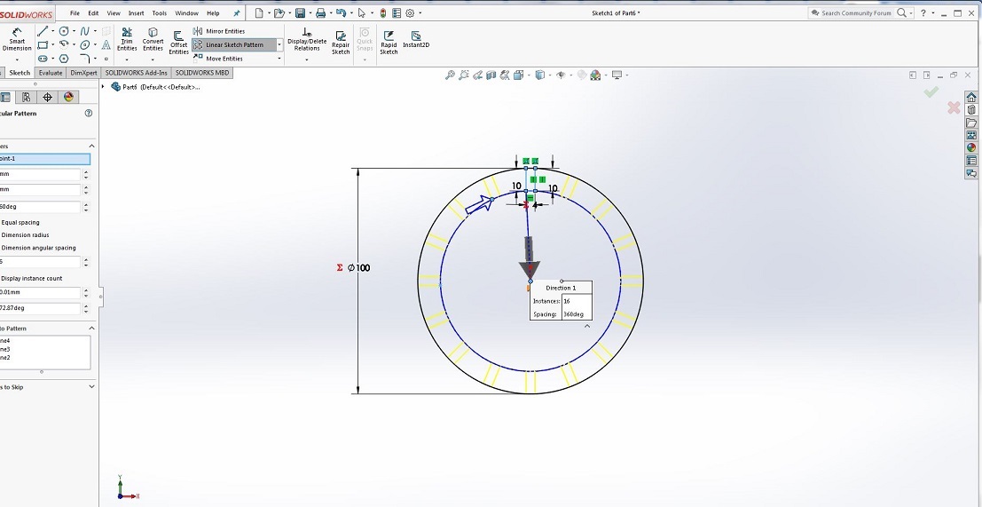 •I select some lines for making slot which I have to copy and use tool "circular sketch pattern" to copy them. In circular sketch pattern set the instance and add space