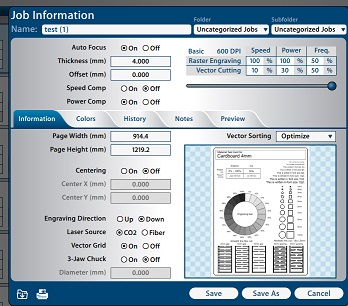 •After selecting the location click "Save" the new information will save in job, click on "print" (top left corner in Epilog Job Manager) to transfer job to laser cutting machine.