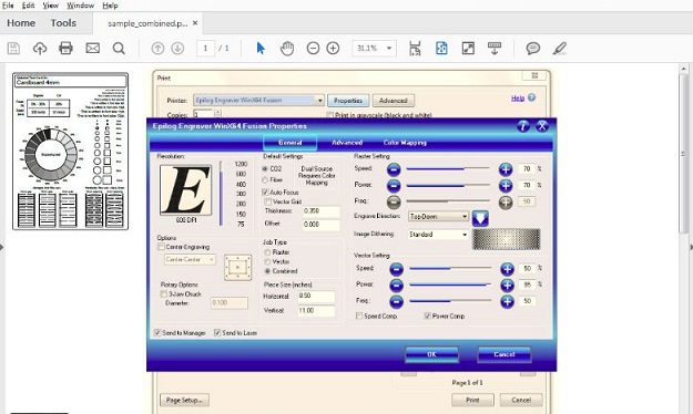 •After that we open PDF file and press Ctrl+P to open printing properties,than We click on Combined in "Job Type" tab, then we set cutting power and speed to 35% and 10% respectively. After setting up parameters for the job click "OK" and the job transfer to Epilog Job Manager.