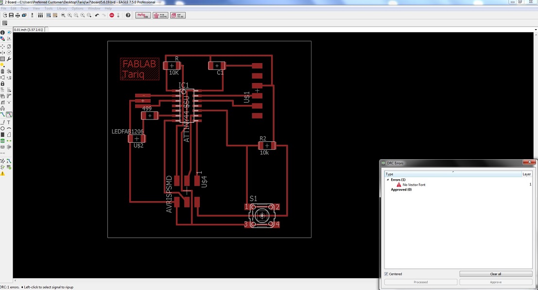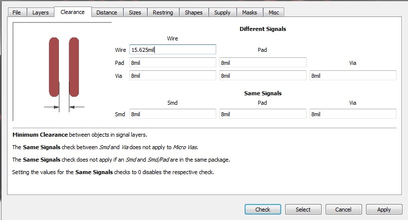 Board is completed and go to DRC (Design Rule Check) command,in clearance i put the value endmill 1/64" in 15.625 mil.