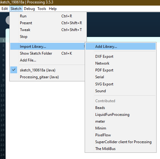 In order to install the required libraries we need to navigate to Sketch -> Import Library -> Add Library....I hav typed too much let me show instead: