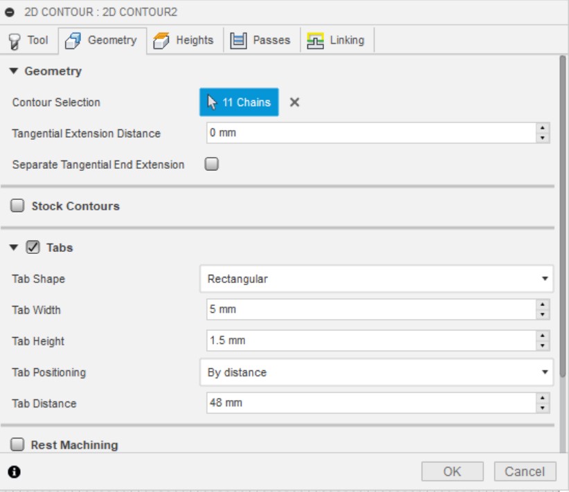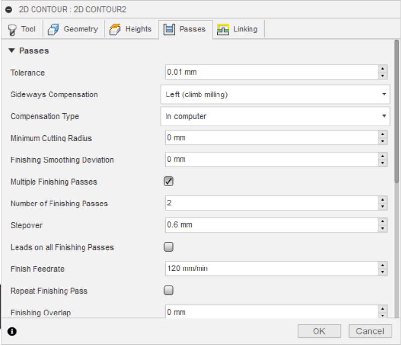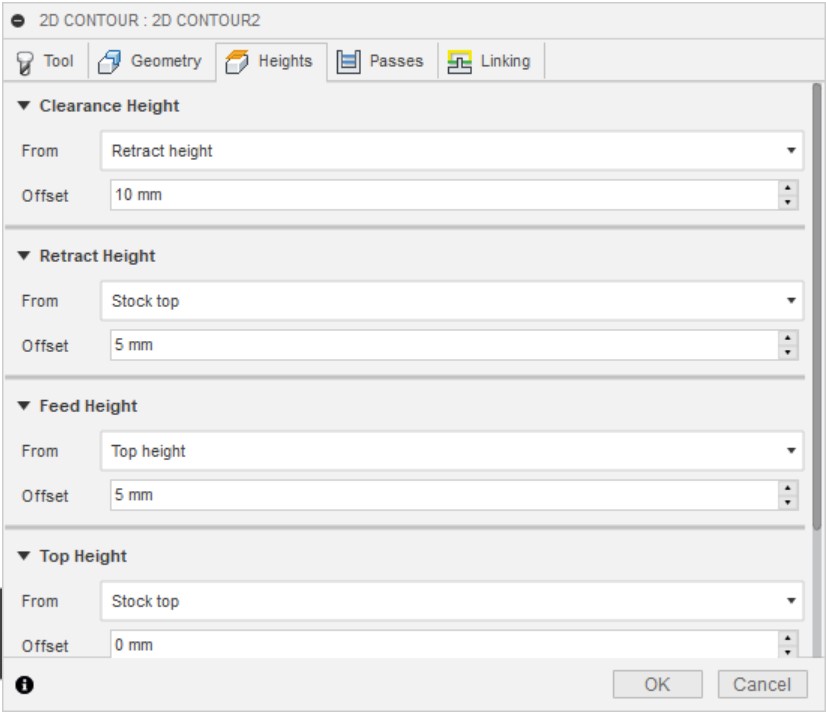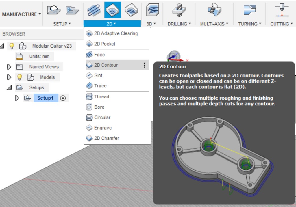 For this job, I selected 2D Contour. This because, I have no 3D elements (curvatures) in my design and no pockets, that need clearing.