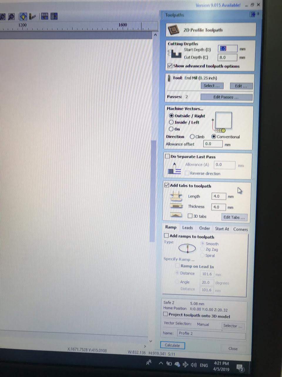 The settings for the Shopbot (info for the machine can be found in the cutting section) are as following: