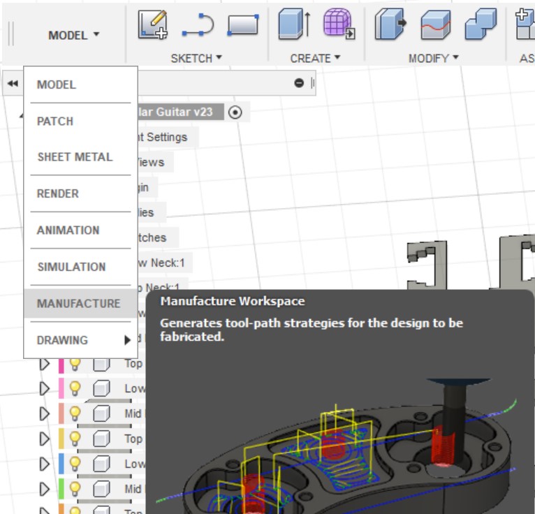 After we have our design, it is time to prep for the machining. The CAM process can be found in the dropdown menu on the Toolbar. the CAM feature is called Manufacturing.