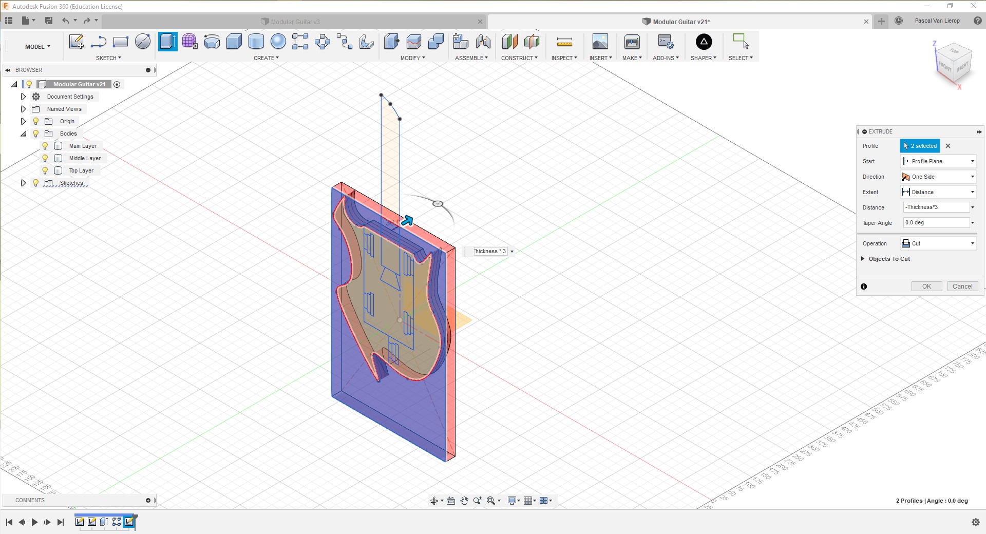 After you have cut the slab, you are left with the guitar neck, which is still a sketch. Extrude the neck in order to create a new body element.