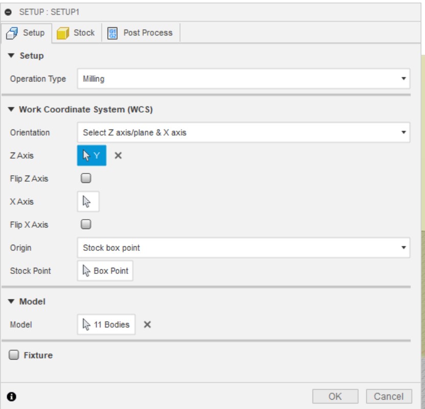 In the setup, we need to select our 0 point and we can do this in many different ways, but I selected the box point (rather the upper-left edge of my stock)