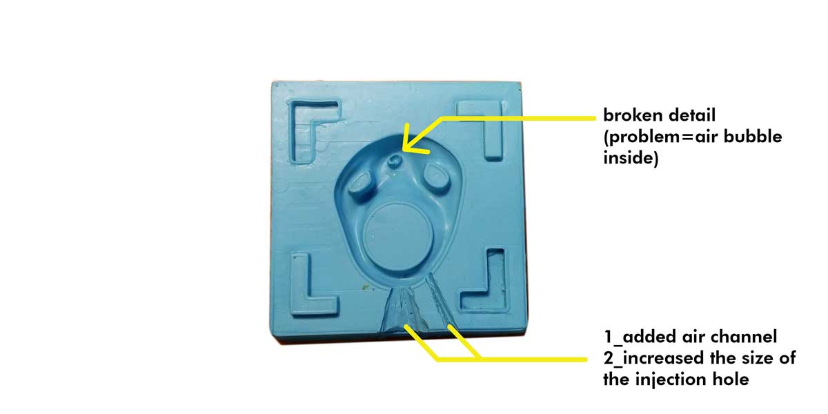 part of th mold broke (a tiny detail in the holes), this happened becuase that tiny part had air bubbles