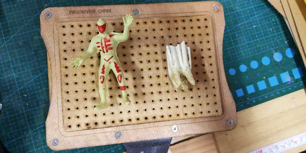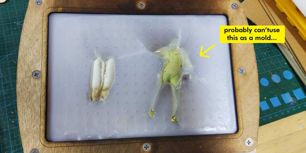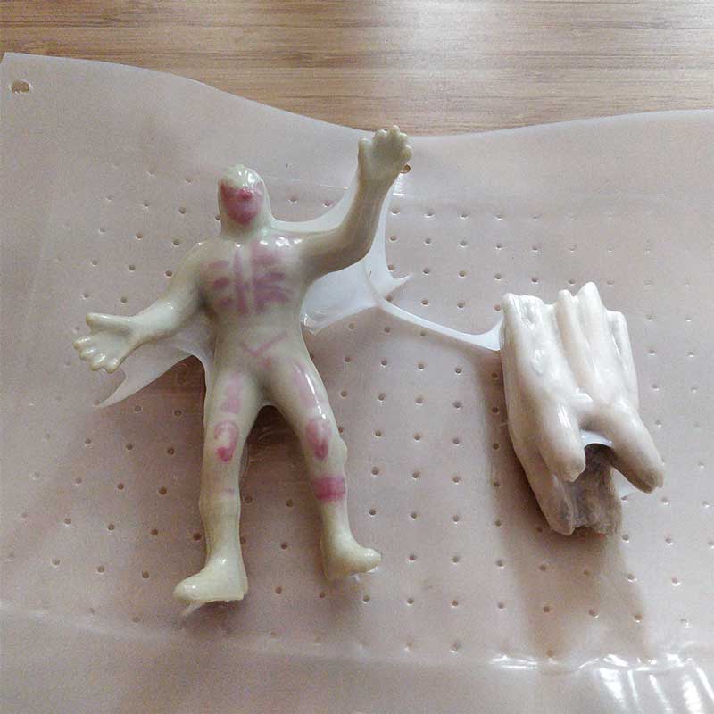 I wanted to experiment a bit with the vacuum molding, and I used some LUCHADOR toy and a cow's tooth to make some molds, but... I called this more "The trapped Luchador and tooth".