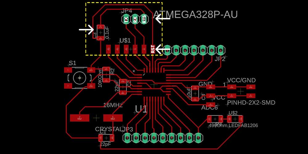At this point I really thought I had a bad energy towards PCBs, I scratch my head and rechecked both boards connections, I cleaned very well the paths with a sharp knife, I tried different FTDI cables, I tried connecting the RTS of the FTDI cable instead to the RST pin on my pin headers, I tried on other computers, but it didn't work. All my boards under the same spell and I couldn't find the issue. It was weird that my last Sarduino worked the day before but now not anymore, I started to think that was all an illusion...