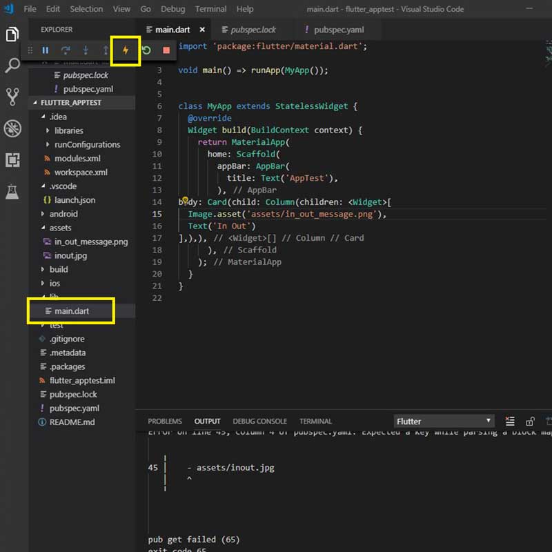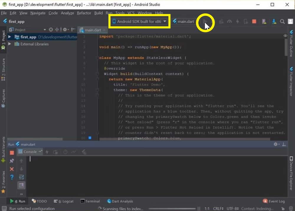 After this long process of installation, you are ready to start coding to create our first app. On the image below I highlighted the which is the hot run button that will run the code into the emulator. The main.dart is the main code of the app, you shouldn't change the name of it, because when you run flutter it will look into the directory for this file and if it has a different name it won't be able to locate ir (like when running make).