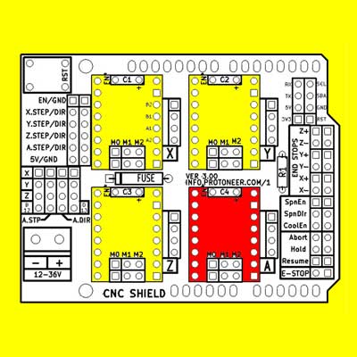 The CNC shield that we are using works together with an Arduino Uno board, is mounted on top of it and