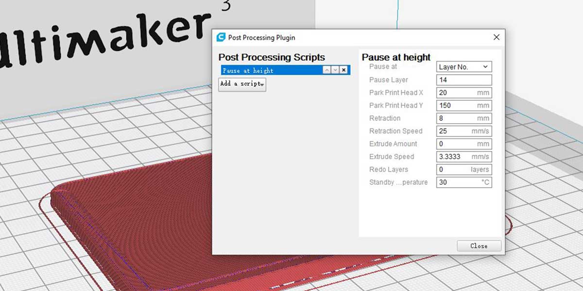 To set up pause at height function inside CURA just go to: Extensions > Post