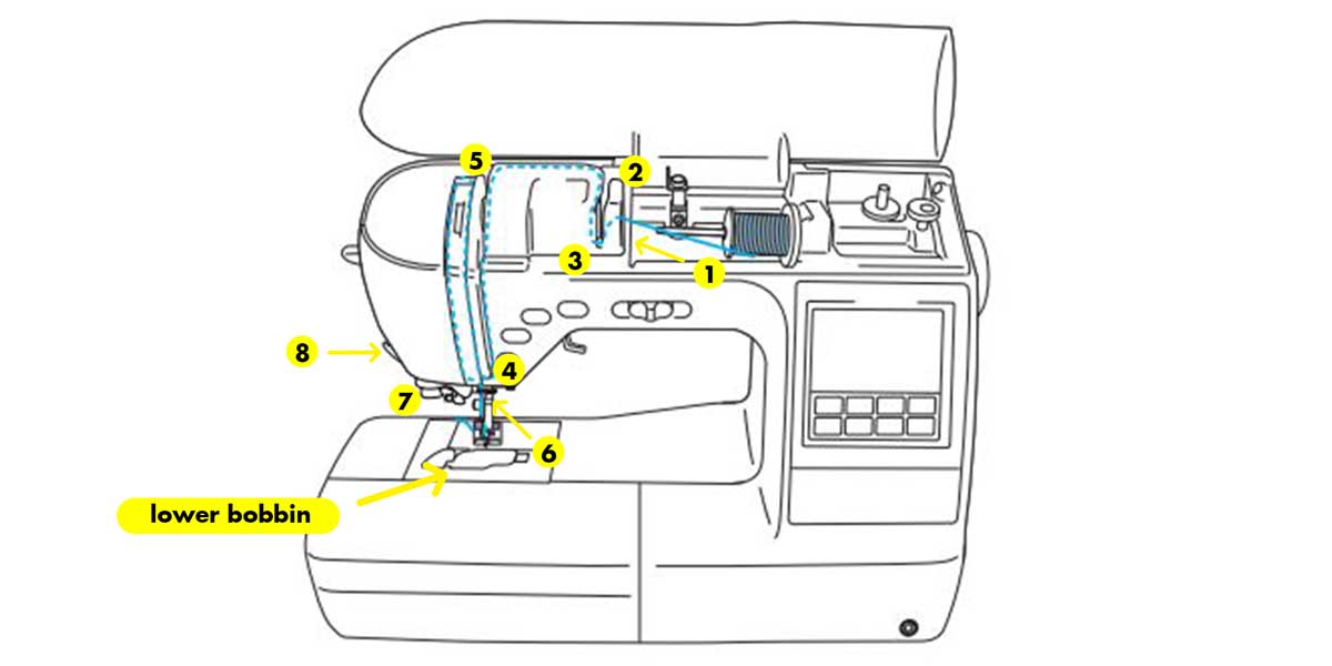 First thing to do is learning how to place the thread on the upper spool, which is very simple and is well explained on page 31 of the manual of the link above. Here is a diagram from the manual where I pin out the sequence on how to place the thread:
