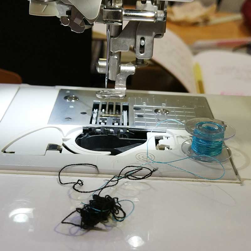 Once you place the upper spool, you need to make sure you load and place a bobbin that goes inside the indicated area. Without this bobbin you won't have the bottom stitch and you would be sewing in the air, so make sure to load one, check page 28 of the manual or ask your grandma how to do it =P if you don't have internet...