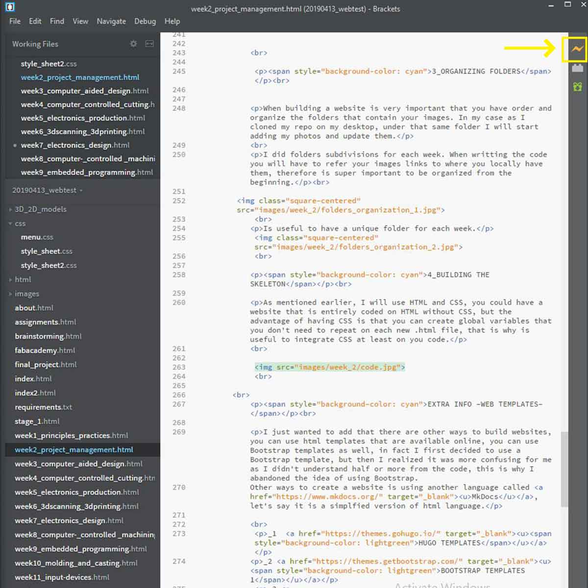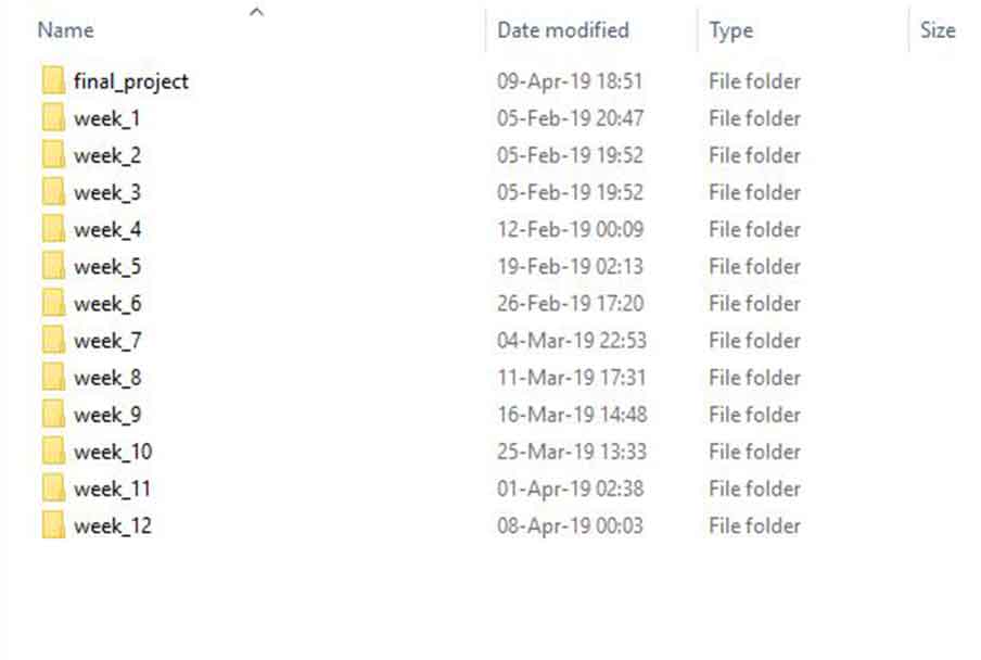 I did folders subdivisions for each week. When writting the code you will have to refer your images links to where you locally have them, therefore is super important to be organized from the beginning.