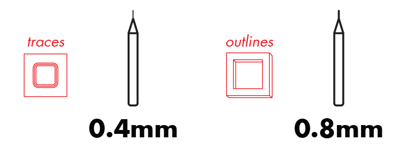The drills we will be using are one of .4mm (only for the traces) and one .8mm only for the outlines