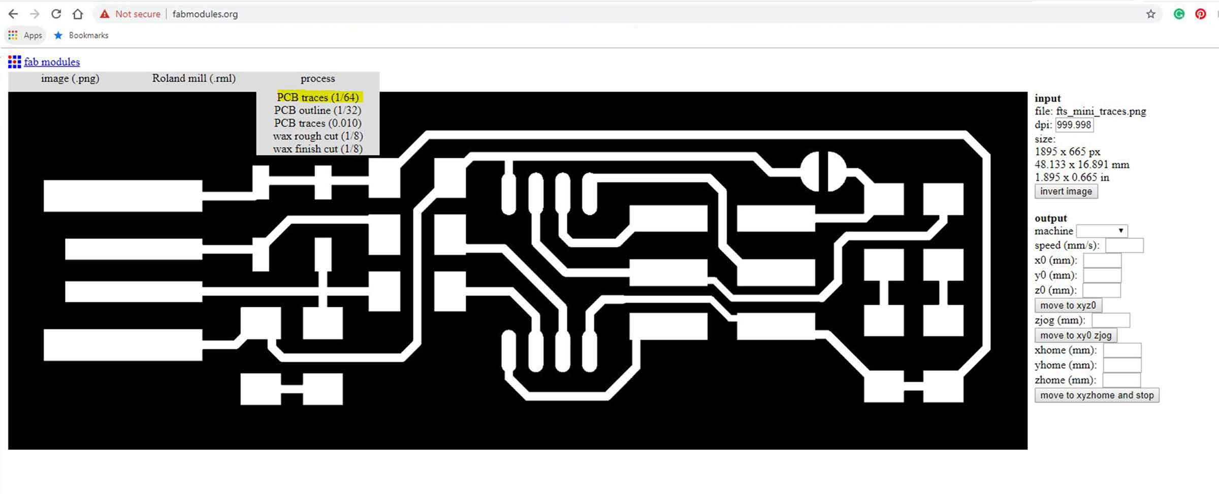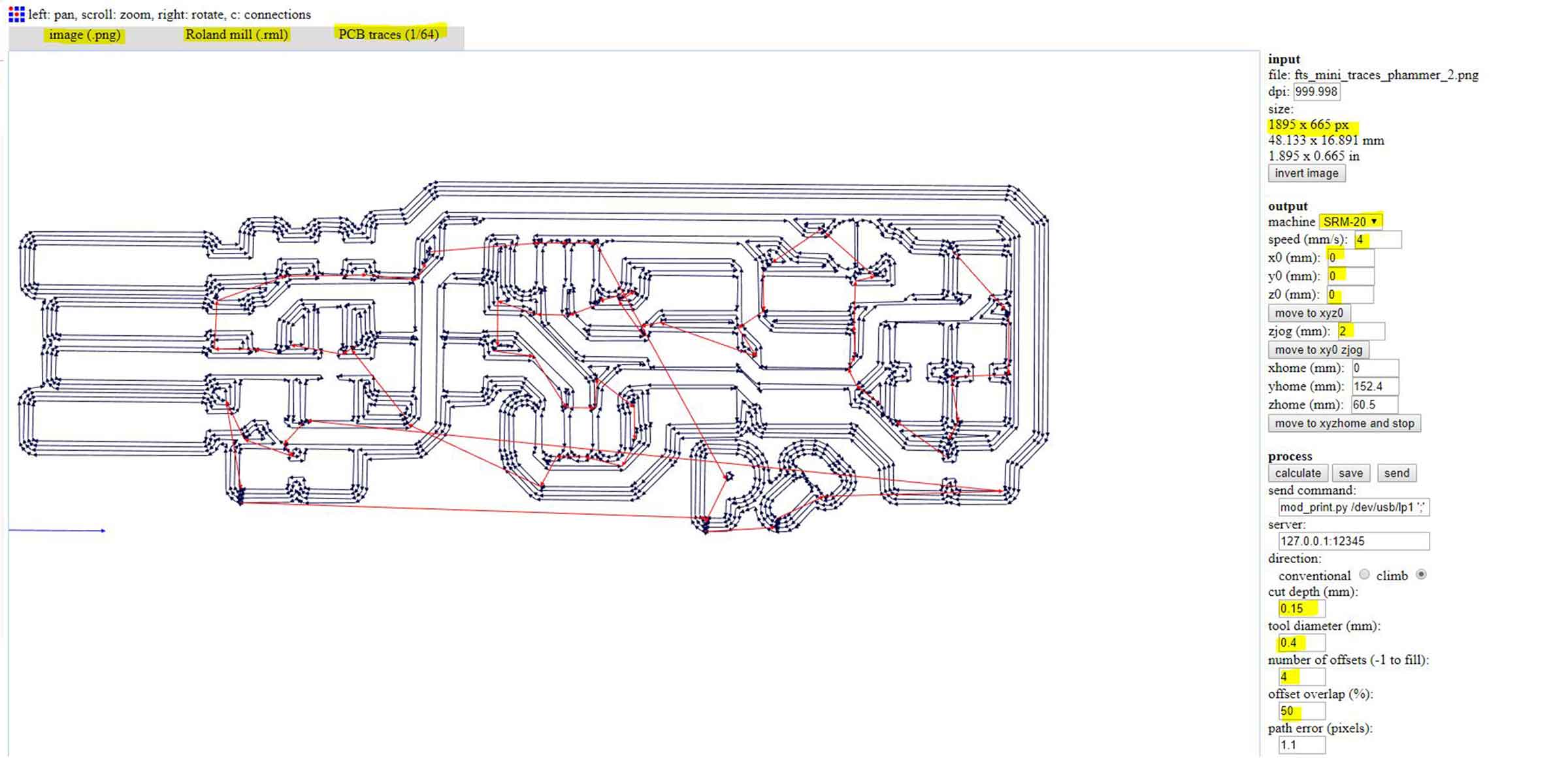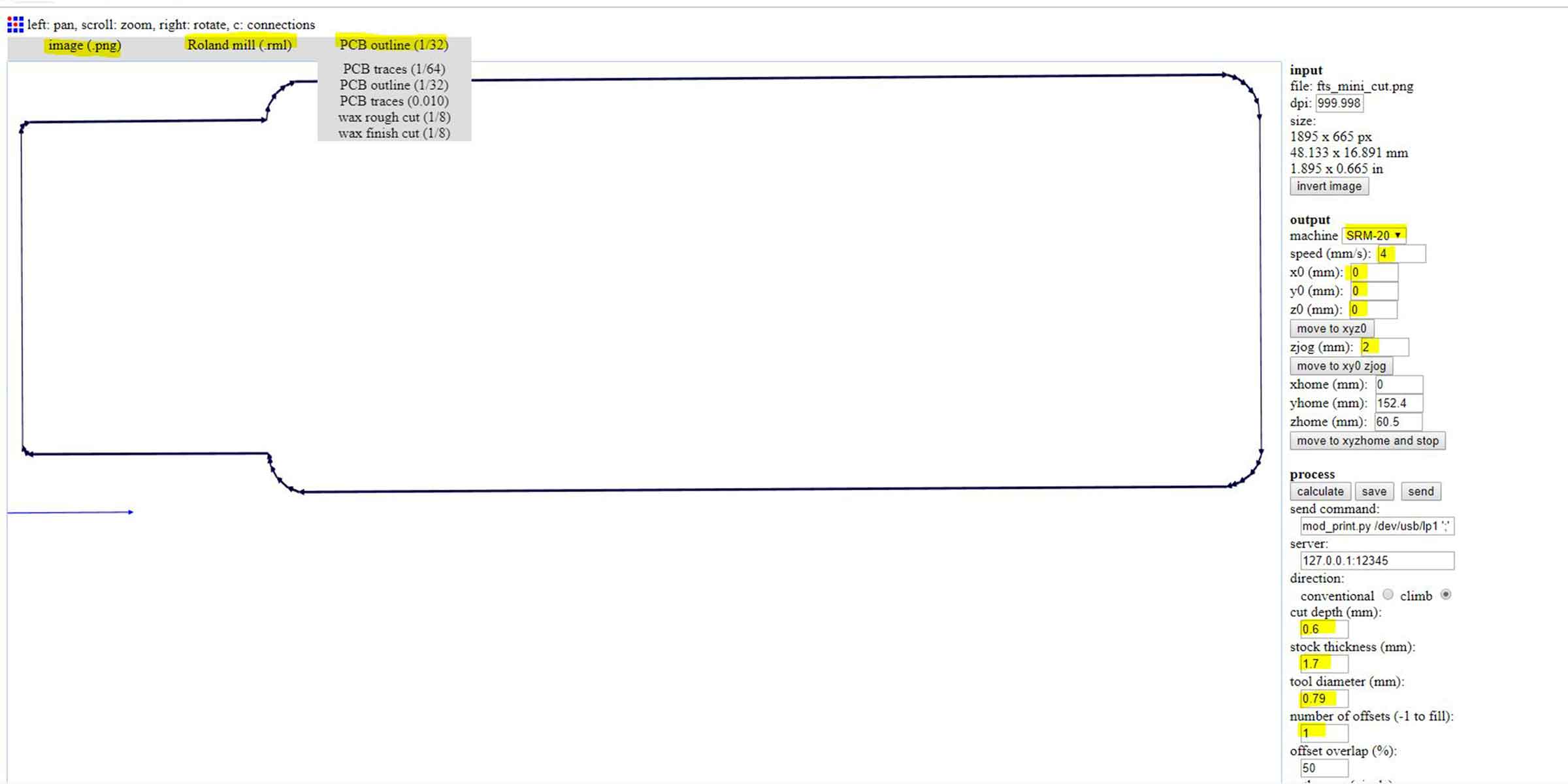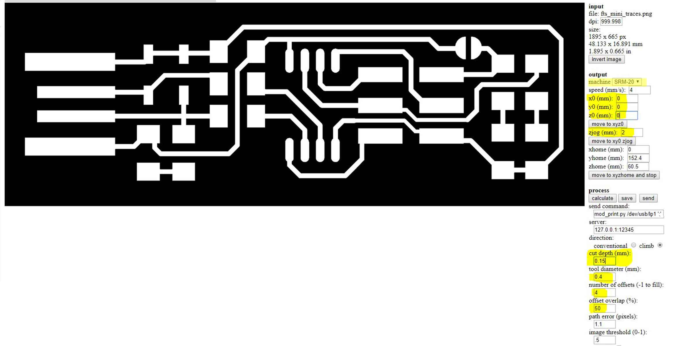 Using FabModules I set up the machine parameters for both the trace and outline files.