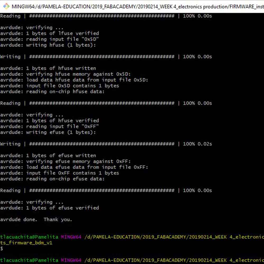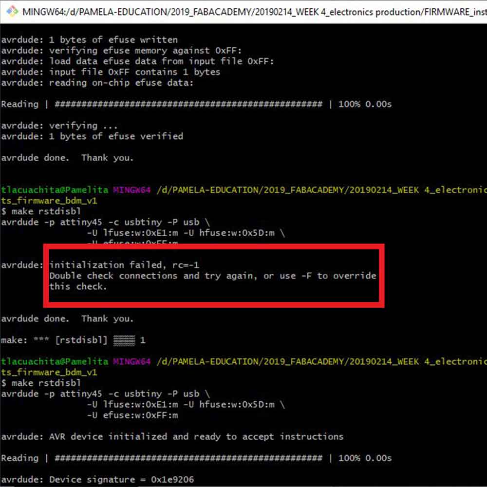 (If you get "initialization failed, rc=-1" means that avrdude run correctly as it found the programmer but not the new FABISP, this is normal as it was not connected at this point, so is ok.