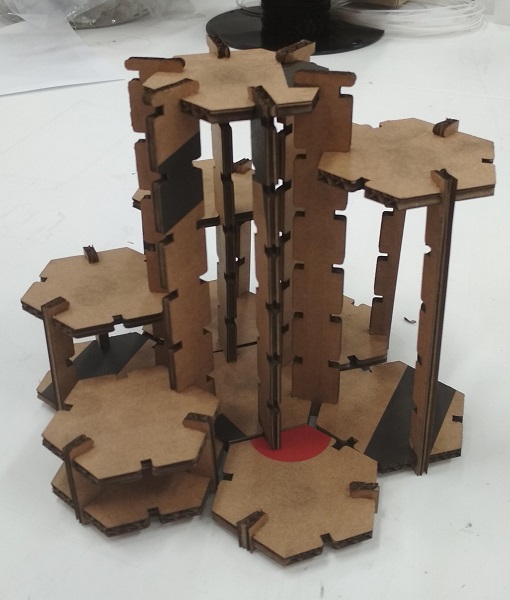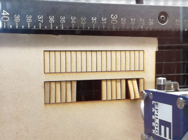 We had a simple design created with Inkscape and saved as pdf for the cutting, 0,02 mm line width. We used 3 mm MDF.