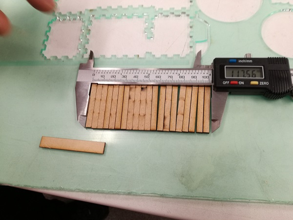 To measure the Kerf we decided to cut 20 small pieces and measure them all together. The difference between measured number and the number in the drawing will be Kerf*20. We chose 3mm Acrylic and 3mm MDF as our test samples. We used Inkscape to make a simple drawing. The drawing is a rectangle 100x40mm devided in 20 5x40mm pieces.