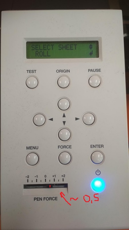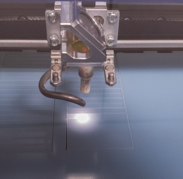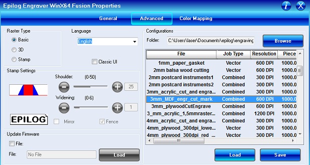 Epilog Fusion M2 40 and Epilog Mini 24 are CO2 laser cutters operating in infrared range. The cutting starts from the upper-left corner of the drawing until it's defined differently. By Up and Down buttons you can choose parameter you want to set. Then you can adjust it by joystick.