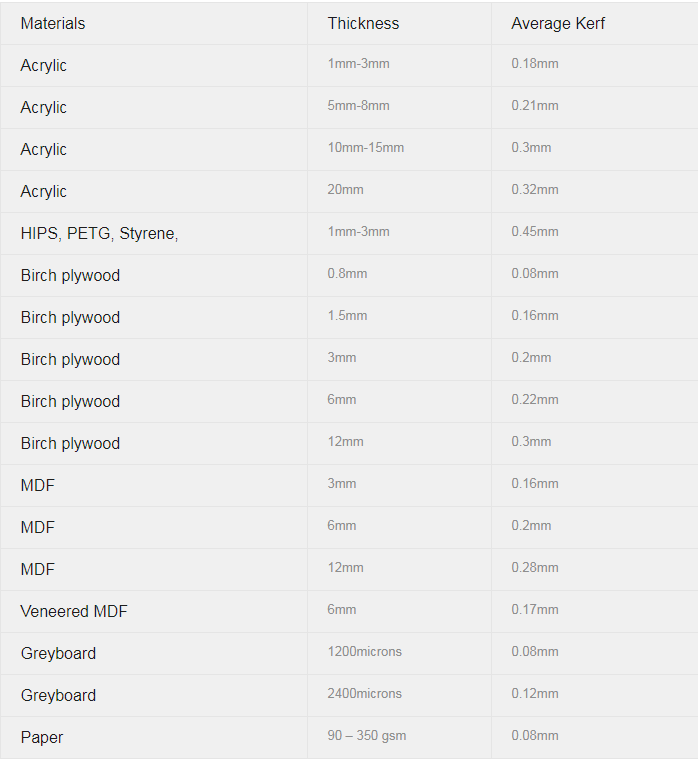 Kerf depends on the material, speed, power, frequency, moon position and other parameters but there's average value for each material. It's important to take account of kerf in the drawing. You can use the offset tool or make a Parametric Design