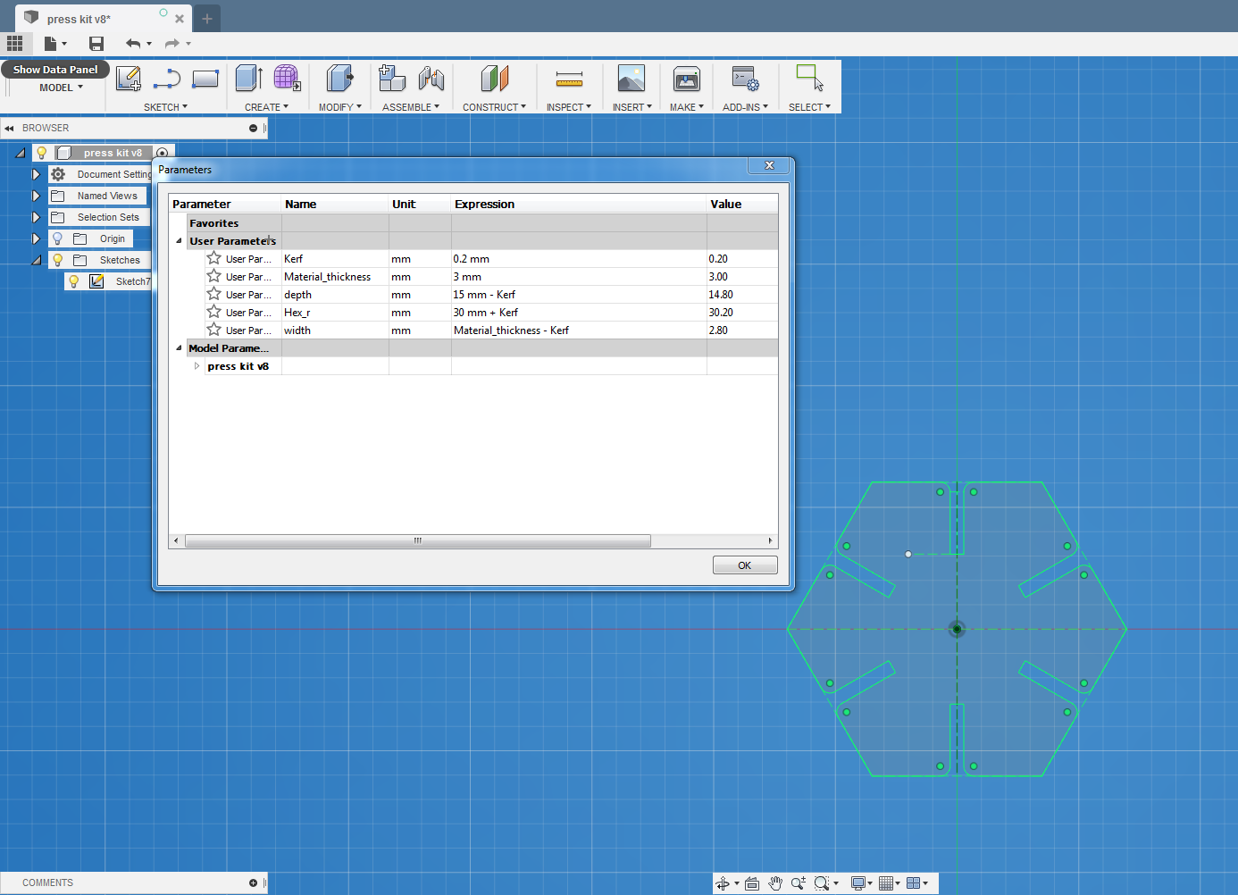 I used Fusion 360 to make the design for this week. I've like Hexagonal form so i had an idea how to start. After only 11-12 attemps I drew a proper sketch where I could change parameters of my piece.