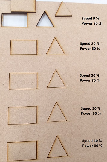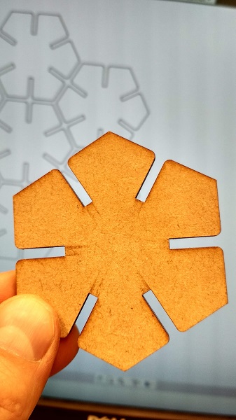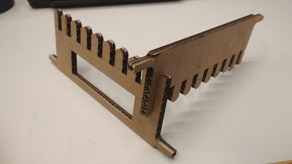 I started by drawing a test pice in Inkscare just to test the pressfit joint. The design is a crest with 0.1mm step between teeth. I cut it from 6,5 mm cardboad and it was the first issue. 6,5 mm cardboard was a tough guy. I failed to cut it 5-6 times. I even removed numbers from the drawing because the laser just burned areas with a small details (even with power compression on).