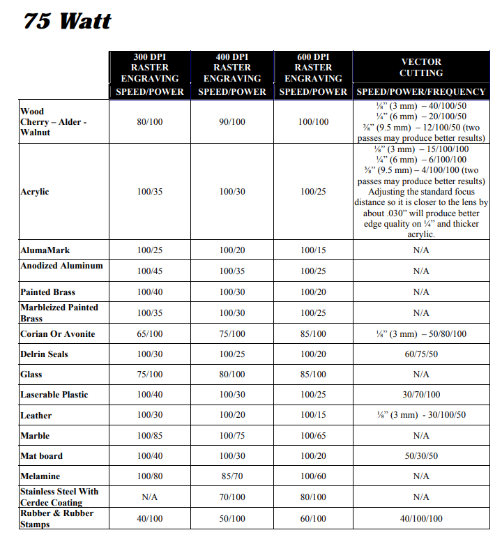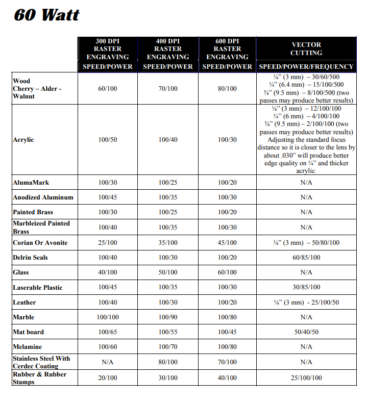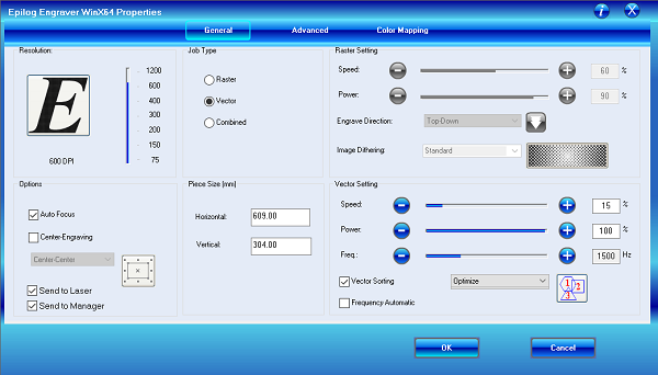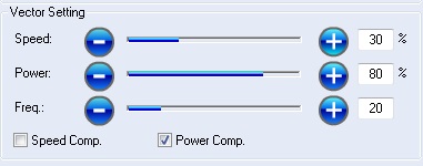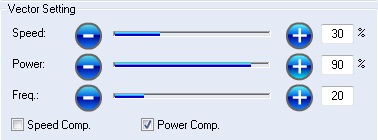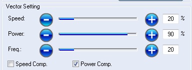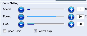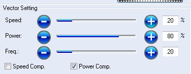 Set the Raster and Vector setting according the material. Below you can find a table with recommended parameters from the manual.