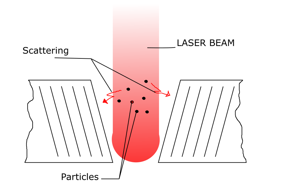 Kerf is the width of material that is removed by a cutting process. Laser beam has width. The width is minimal in focus point. There are different processes going with the material: vaporasing, burning, blasting. So some of the particles stay in the laser beam scattering it.