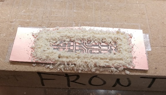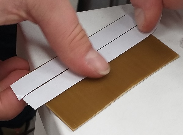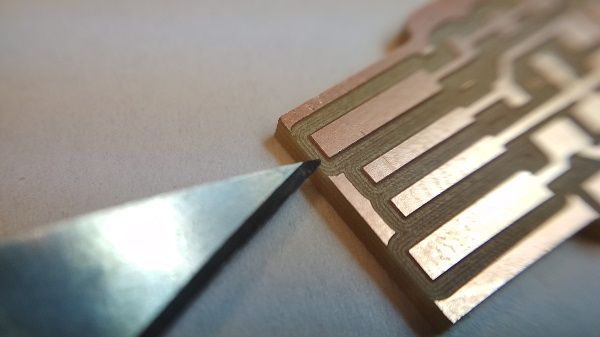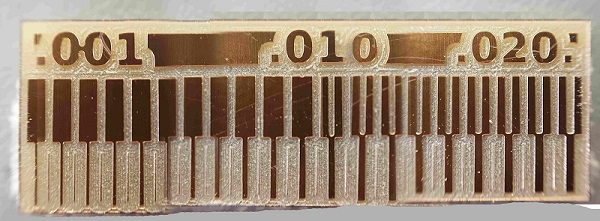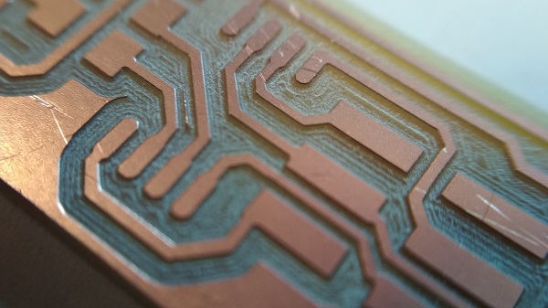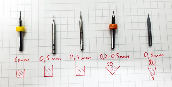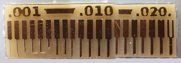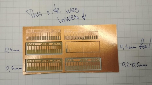 So far no problems occurred. However, there must be something, which is stopping us from creating ultra-small circuits. Something, which prevents from unbelievably precise PCBs. Unfortunately there is couple things. First of all drill size is somewhat limiting us in the milling. Second case is step of motors, this is also not finite and have some strict values. Nevertheless it is usually smaller than used drill and third factor. Even that we are using really small drill sizes, when drill routes are close to each other they will rip copper from the surface. Leaving nothing but an empty hole. We created a test drill to estimate couple constants