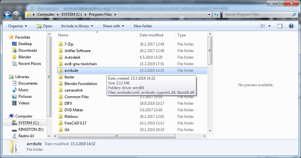 3) Download avrdude, unzipp the folder and copy the archive 'avrude' inside of it to C:\Program Files.