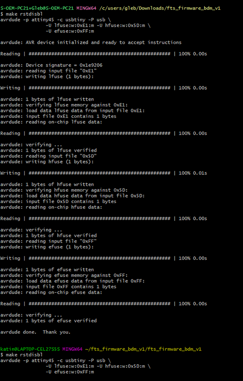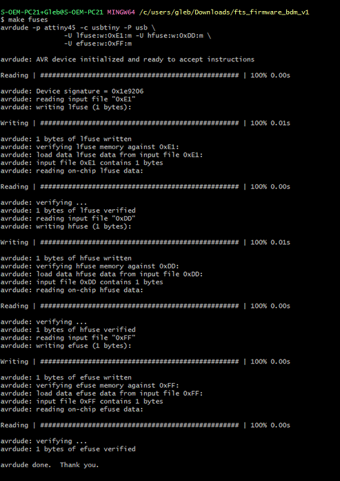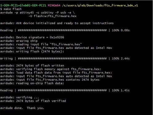 Run make, which erase the target chip, and program its flash memory with the contents of the fts_firmware.hex -file. From the processes below can be seen how avrdude erased (erasing chip), programmed (writing flash), and verified (verifying flash memory against fts_firmware.hex) the chip.