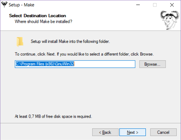 2) Next, download Gnu Make and launch the installer. Accept the default location for the installation, which seemed to be C:\Program Files (x86)\GnuWin32.