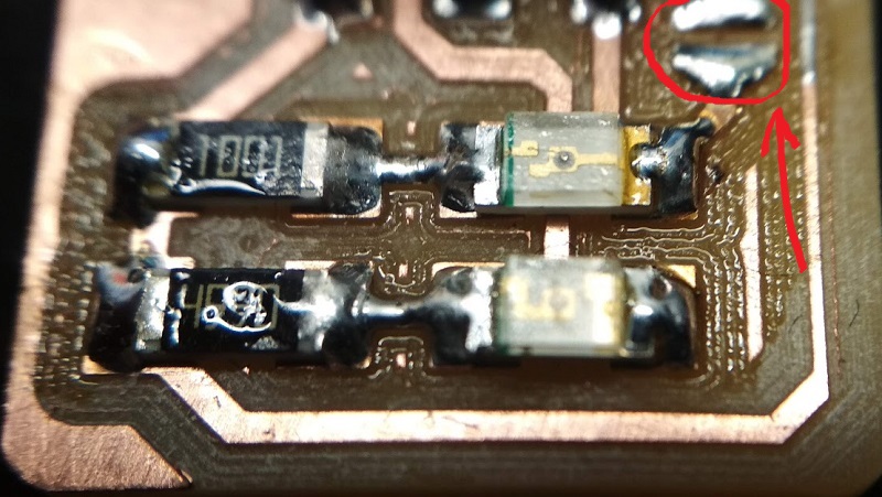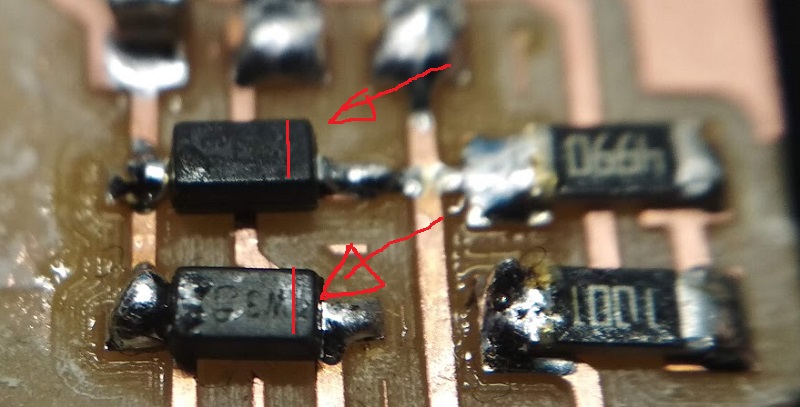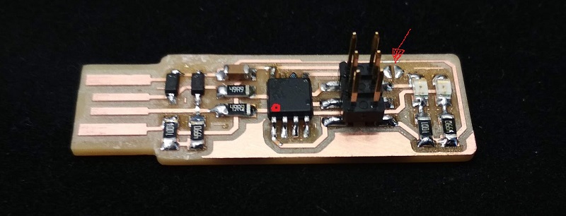 Final step is to disconnect the Vcc from the Vprog pin on the ISP header by removing the temporarily jumper (on the schematic marked as J1). Heat it with the soldering iron and remove the solder with a solder removing tool or a piece of a wire braid.