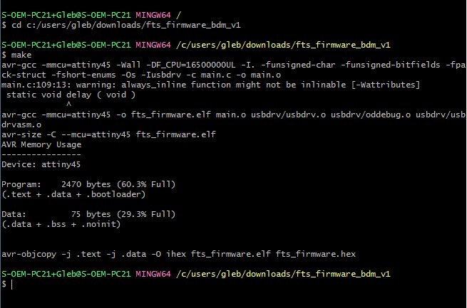 Downloaded the firmware source code and extract the zip file. In Git Bash, navigate into the source code directory, and ran make. The command builds the fts_firmware.hex -file