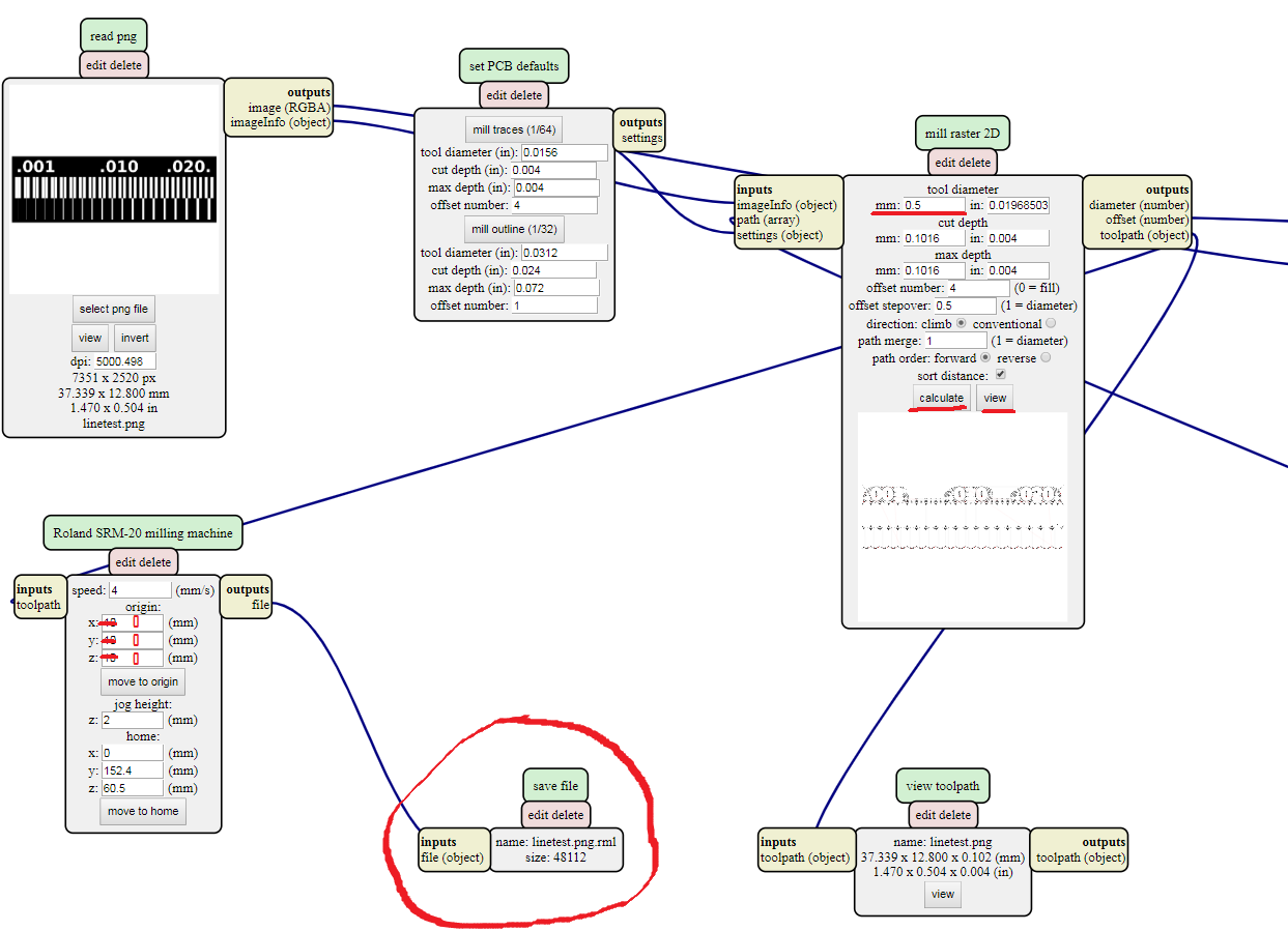 To open this program go to mods then right click on the window and select: programs/open server program/SRM-20(PCB). And we want to save file, not send it to the machine, so delete WebSocket device module and right click on the window and select: modules/open server module/file (save). Then set origin coordinates to (0,0,0) and connect output Roland SRM-20 milling machine and input save file. Open your png file in read png module. Click on mill traces 2D or mill outline in set PCB deafauls. Then define tool diameter and cut depth in mill raster 2D module and press calculate. testlines.png.rml file will be downloaded automatically (this file you should open in the milling machine software). Click view button to check if the created path is correct.