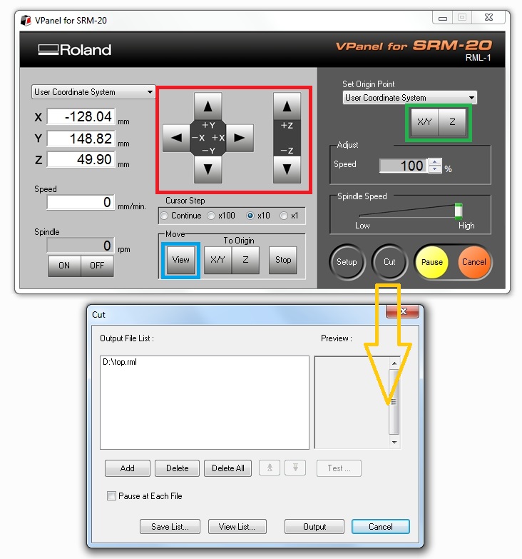 First step is to set the origin point. X,Y and Z buttons (marked with a red rectangle) will move the jog by 1mm, 0.1mm or 0,01mm depending on the chosen step. Continuous mode will move the jog while the button is pressed. FabLab tutors strong recommendation is NOT to use it moving along the Z-axis. So, move the jog to the left-bottom corner of the material, set the X,Y starting point (X/Y button in the green rectangle) then move it down along the Z-axis until it will be less than 1mm to the surface. Then you can loose the clutch and carefully drop the milling bit to the surface. Don't forget to tighten the clutch after. Define that point as zero-Z. I like to define the zero Z point a little bit higher than the surface and start the job. That way I can see if the stock plate is not plane enogh and I can fix it with no harm done. View button will move the platform forward so you can take a look how it's going. After all zero-points are defined press Cut and choose a .rml file. When you press Output the job will start immideately. At every point of the job you can Pause, move to the view position, take a look and continue or cancel the process.