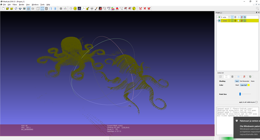 As you can see from the picutre, the point cloud I got is not dence enough to make a nice Mesh from it. But at the same time, you can see the advantage the 3D scanning technology gives us: we can transfer physical object into digital space. It can find use in very different areas: 3D printing (who will refuse a miniature model of himself, for exemple), game industry, virtual reality, different types of simulations etc. Modeling a complicated shape - if a difficult and time consuming task. 3D scanning is not so easy, but it works better and better day by day. I tried a 3D scanning app for Android as well, but I didn't really like it, so I don't want to advertise it. The idea of it is nice: you take a lot of pictures of an object from a certain distance and angles, and the app gives you a point cloud or ready mesh. The app I used had export only in the premium version. Anyway, the result I got from it does not worth publishing.