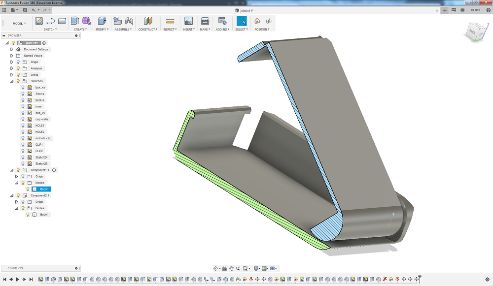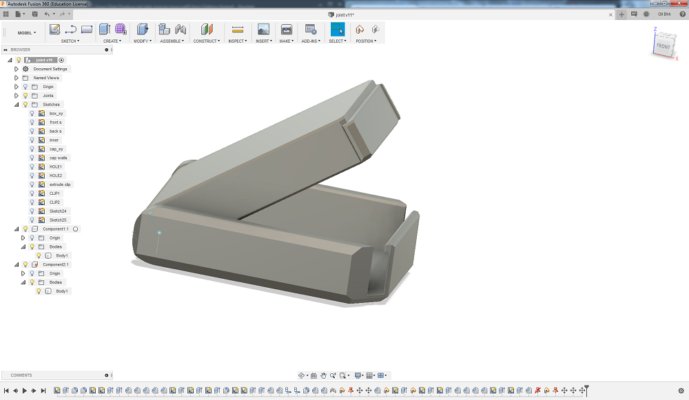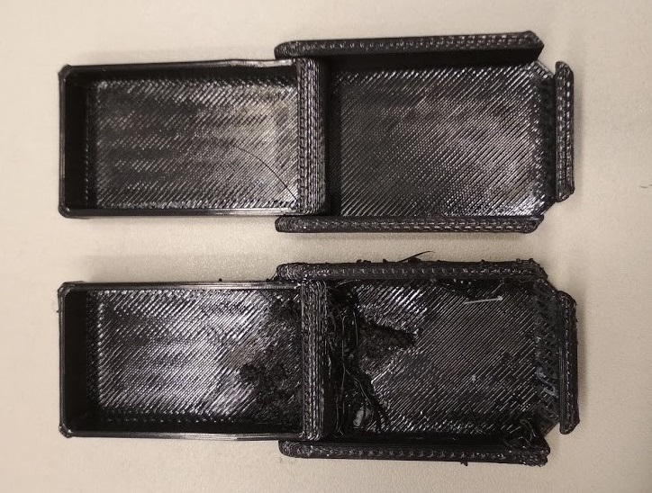 This print is from my previous STL file, where the cap was placed in parallel to the main part. The slicer didn't create support material in between them and it was really hard to make the parts move as planned. But in a new file this problem is solved. Anyway, the box works as planned. It closes with a really nice click and stays closed until you pull the clip back.