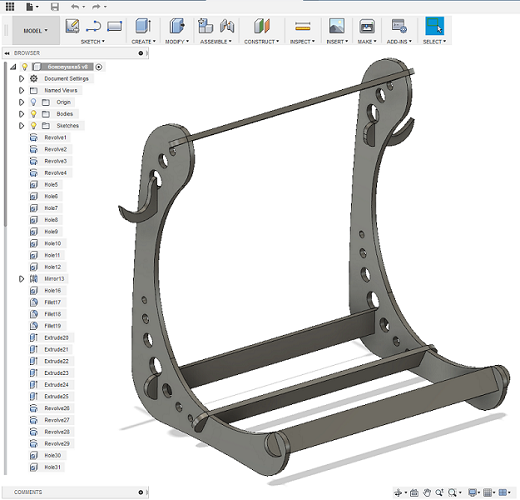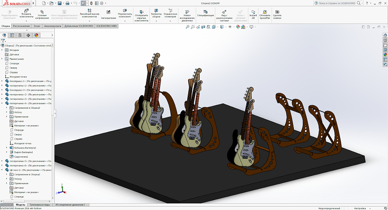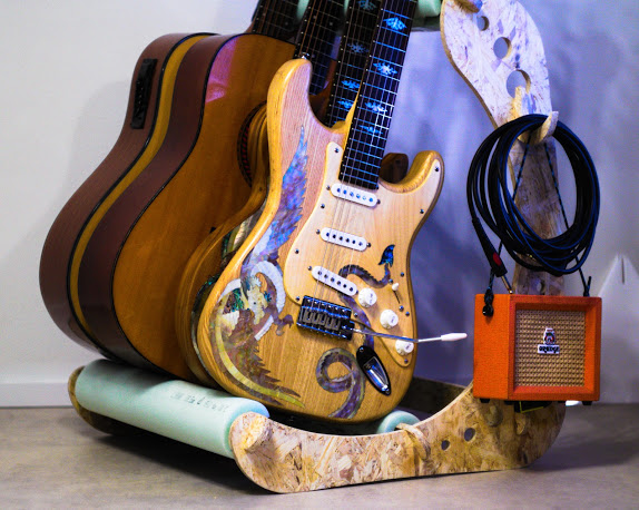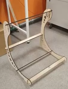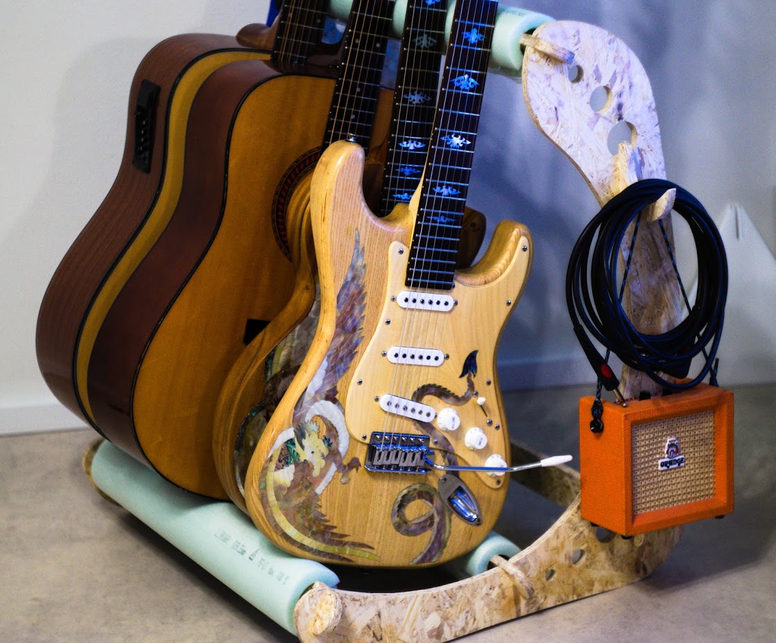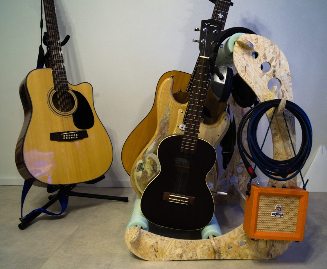 The idea of this project appeared about six months ago. The design was made in collaboration with my good friend and talented engineer Mikhail Lebedev. It is a press-fit guitar stand. I even cut a test version on the laser cutter from 6mm plywood. But to cut through 6mm plywood I did about 10 passes with the laser. So the kerf was terrible. I assembled it anyway, but 6mm plywood wasn't enough to make the whole construction stable. So the project was waiting for this week for a while.