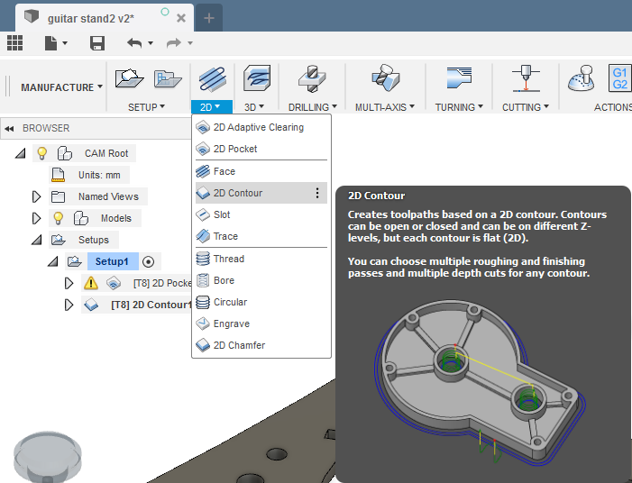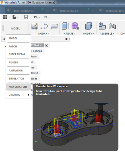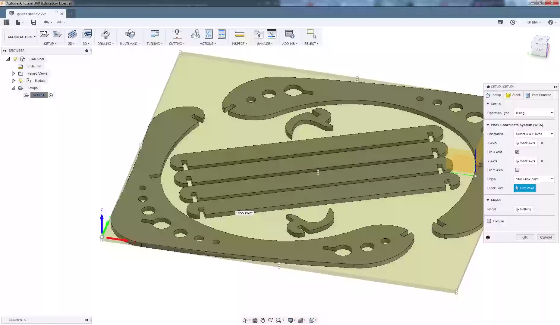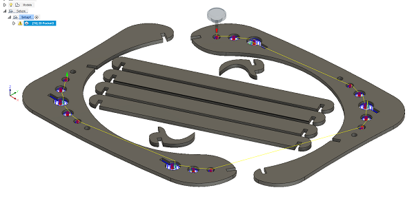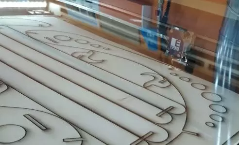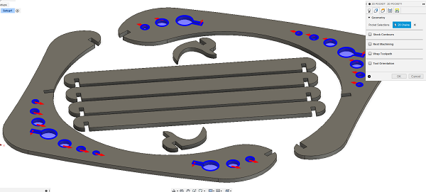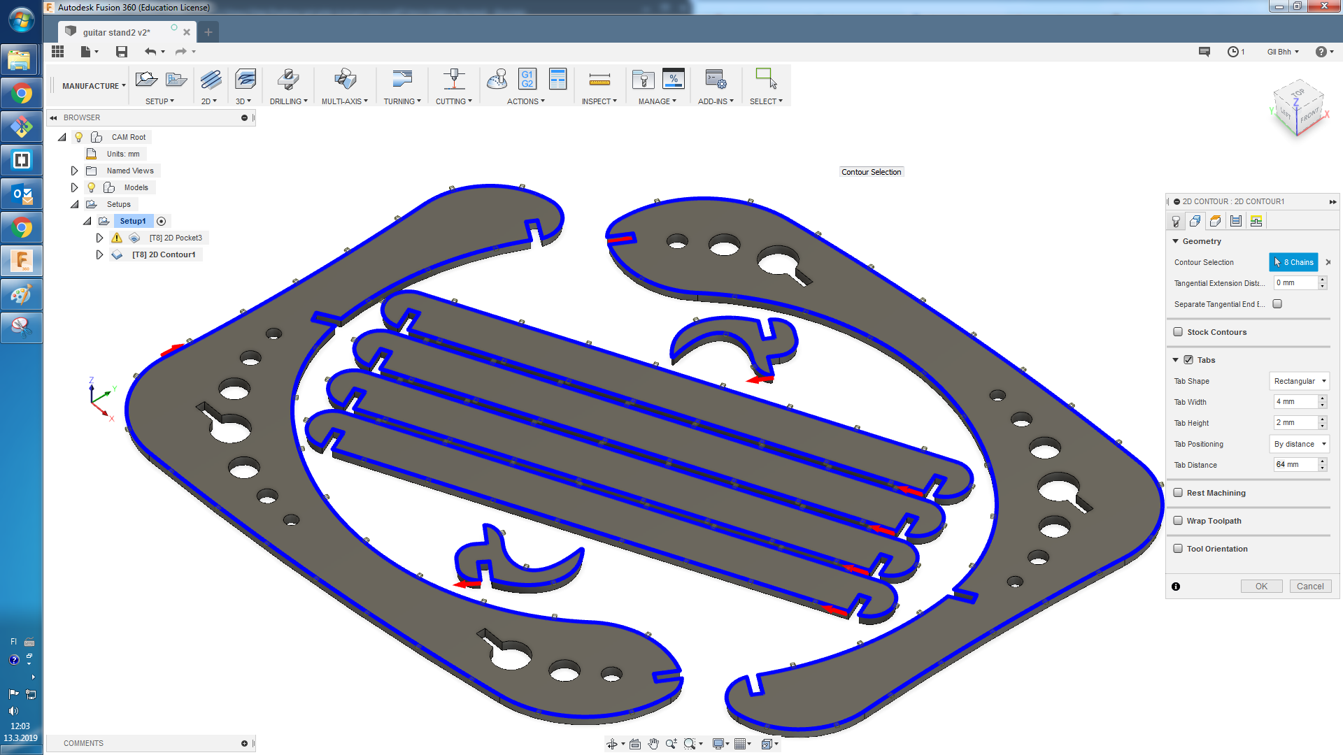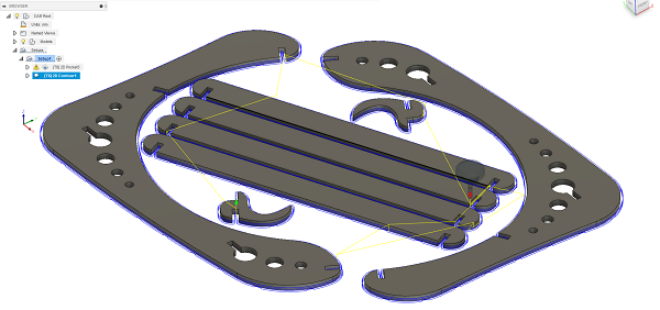 The original design was made in AutoCAD but I don't have a lisense anymore. So I imported side part into Fusion 360. I used Find Features command trying to edit the geometry. But I failed to get a sketch from it. So I Extruded geometry up to 11mm and using the Move command adjusted all joints to 11mm. We measured the thickness of the material earlier and I wanted the joints to be as stiff as possible, so I have not added any kerf number. Then I sketched a hook and a slat. Then I copied elements and Aligned them first into a model and then on one plane. And then I moved to Manufacure part.